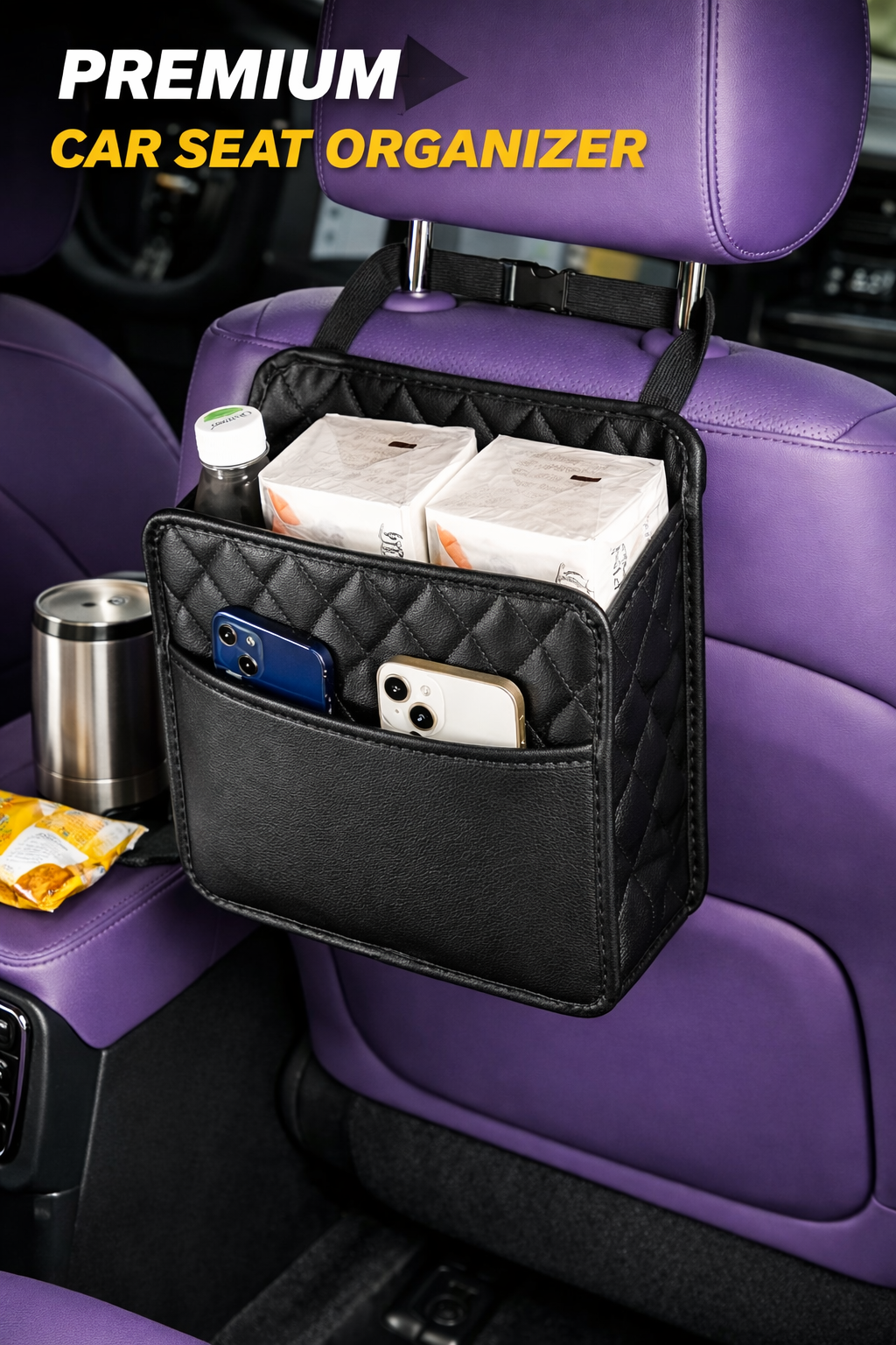 Made from high-quality, durable material with a stylish quilted finish, the bag blends functionality with a modern look. It features multiple compartments to neatly hold items like mobile phones, water bottles, tissues, snacks, wallets, and other small accessories. The sturdy straps attach easily to the seat headrest, ensuring a firm and stable fit without slipping.